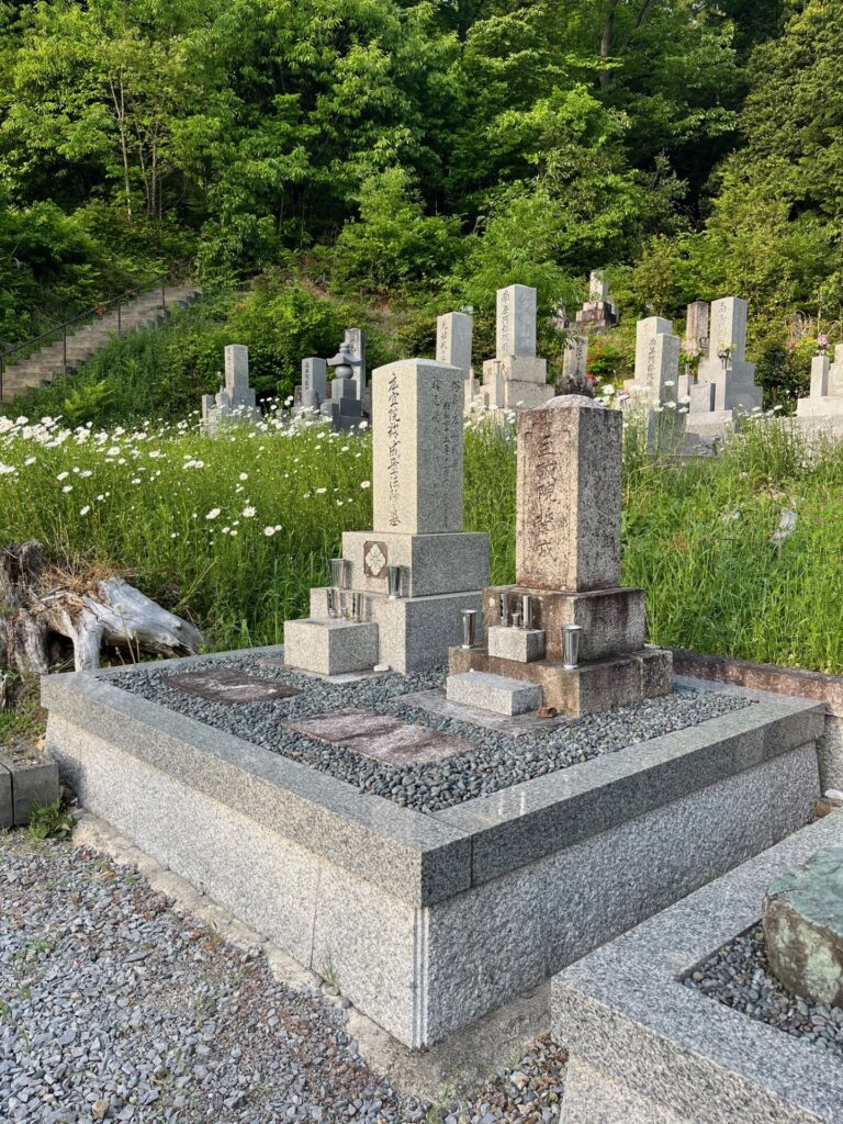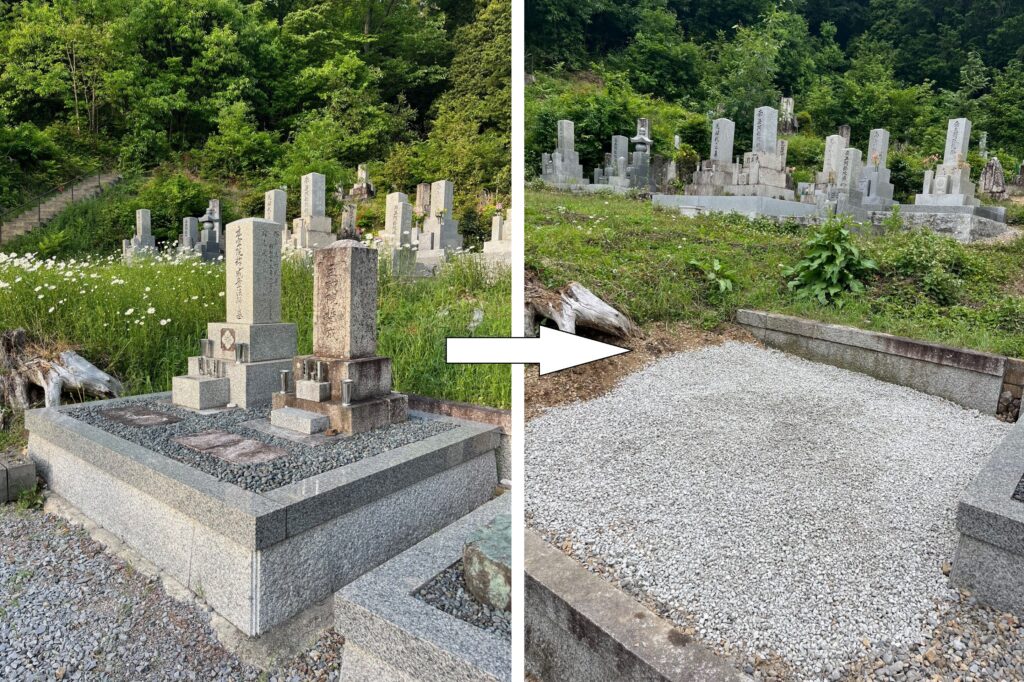 山すその斜面で舞台のある墓石2基の解体撤去をお受けしました。