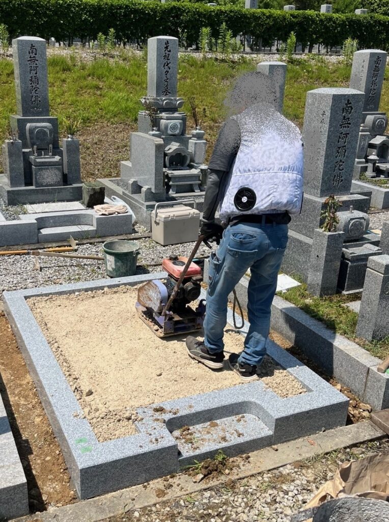 基礎・外柵の施工です。砕石を投入し転圧機をかけ固めます。重い墓石が乗りますので、丁寧に固めました。