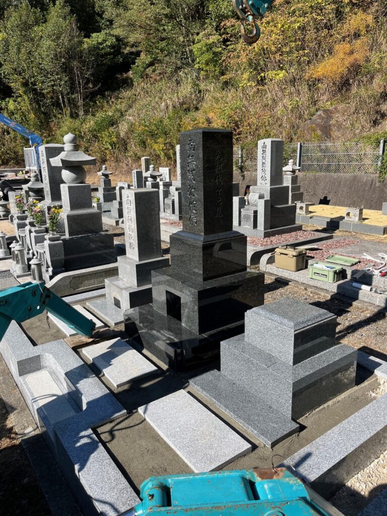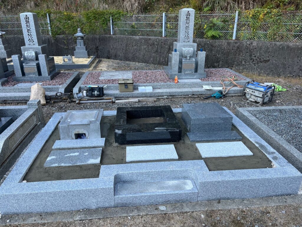中央に施主家の墓石、左右にご親族の墓石を配置しました。施主家の墓石は9寸幅の仏石 芝台付で、ご親族の墓石は、新たに入られるお遺骨が無いため、8寸幅の仏石 二重台にしました。拝石や受け板を設置しセメントで固定しました。区画内も施主様のご要望で雑草対策の為の土間打ちしをしました。