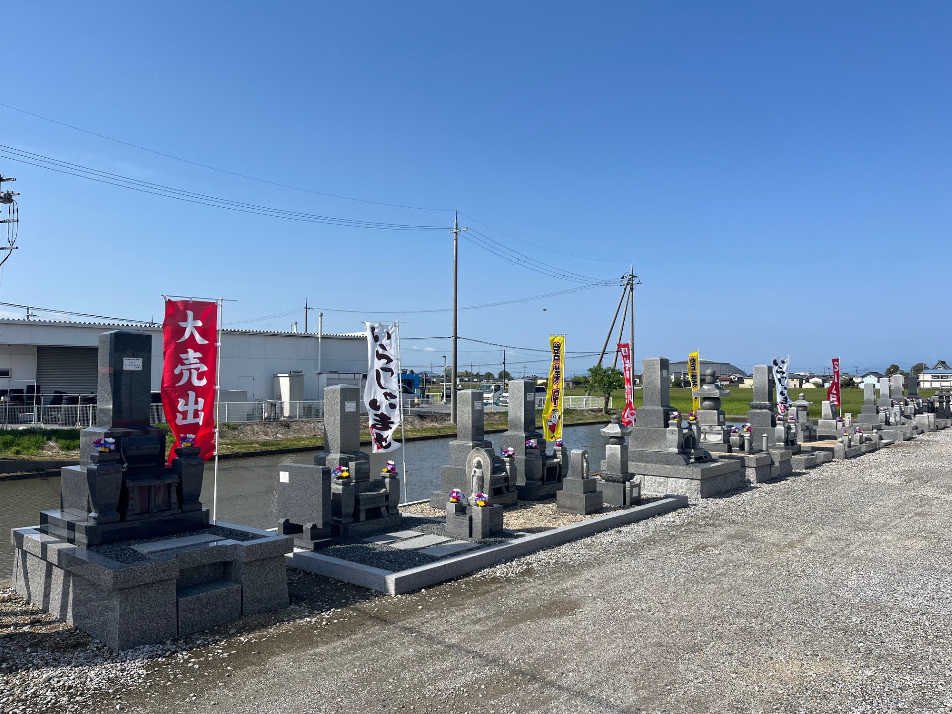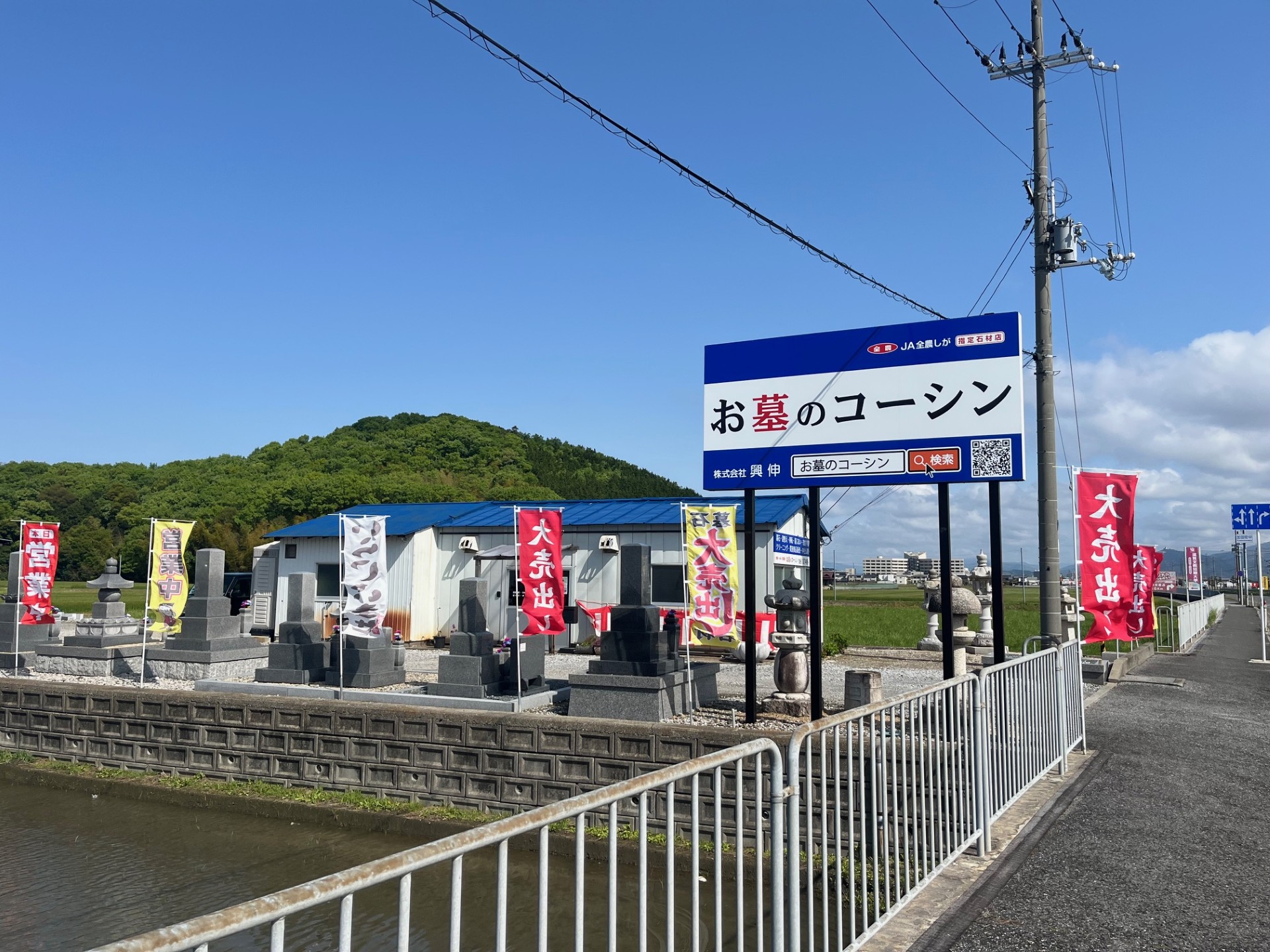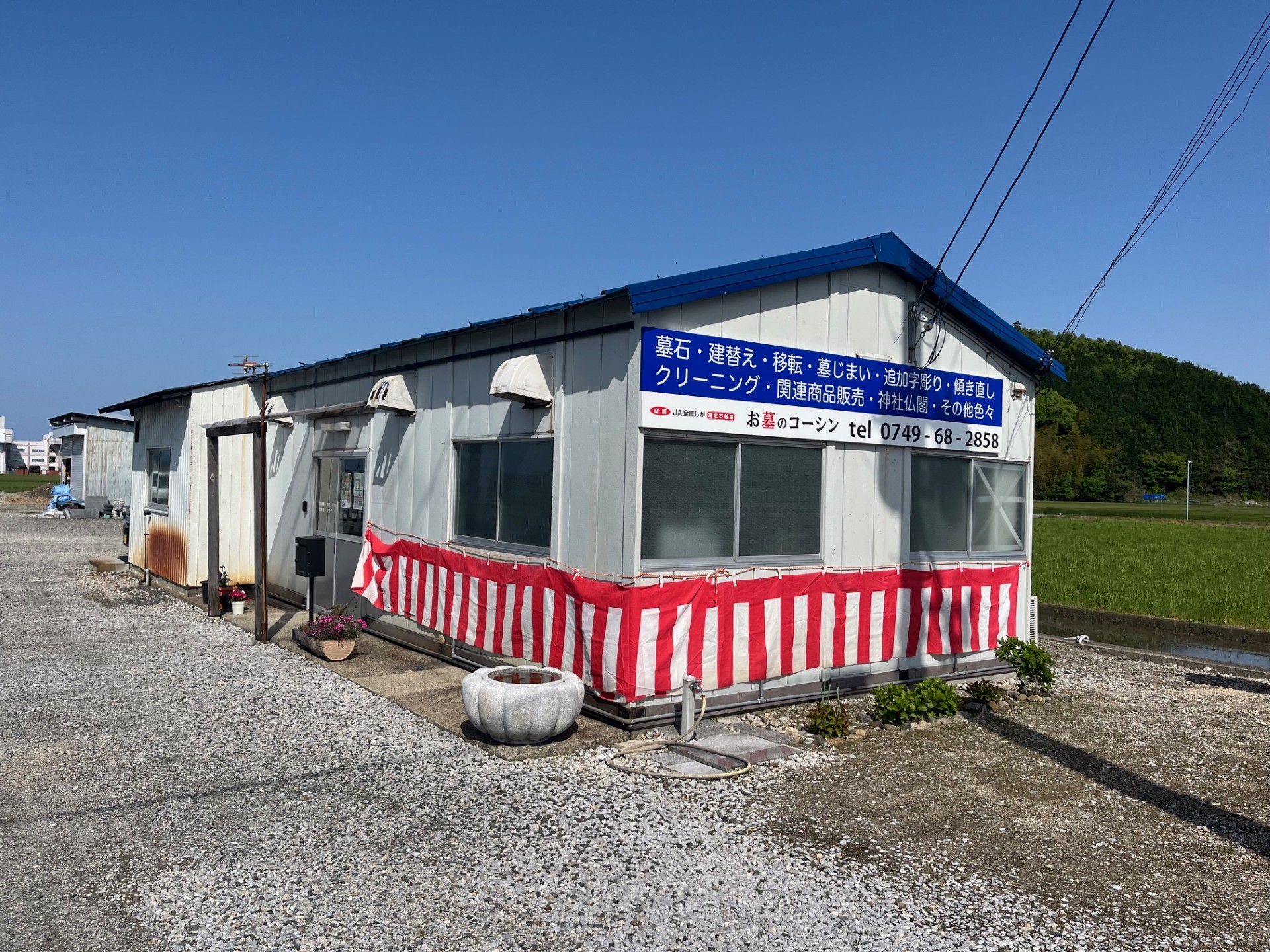 国道8号線加田町交差点より車で北に約500m、長浜バイパス沿いの好立地にある当店。「お墓のコーシン」の看板が目印です。店内には豊富な種類の墓石をはじめ、お墓参りや供養に必要な関連商品を幅広く取り揃えております。