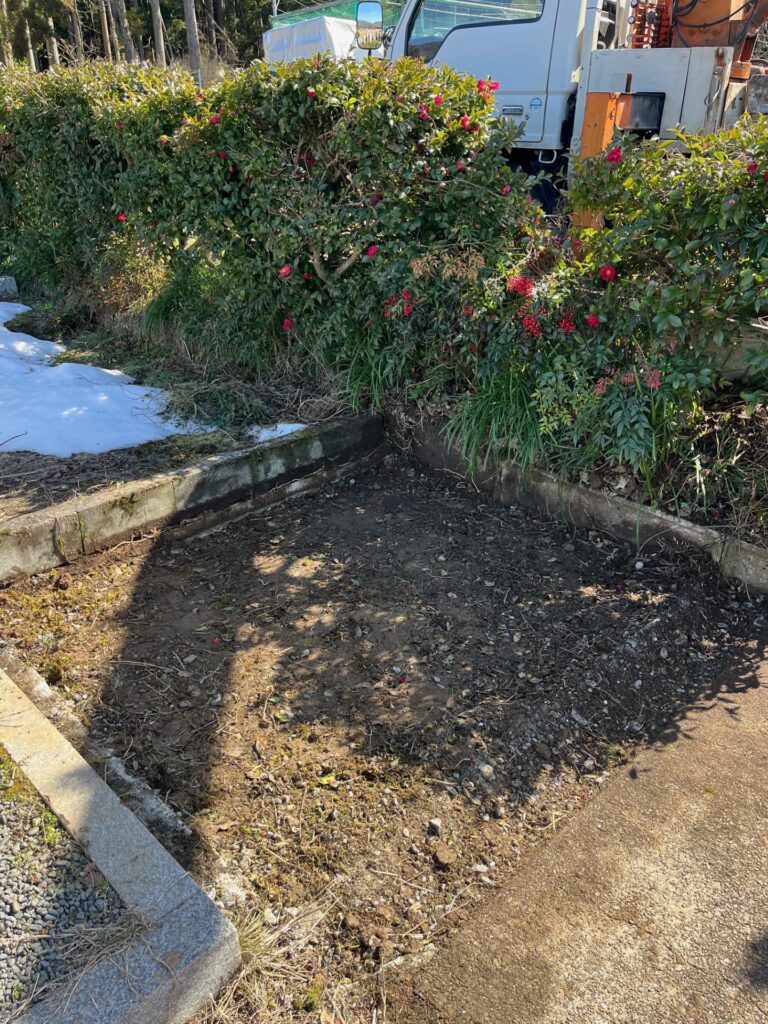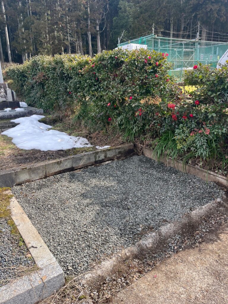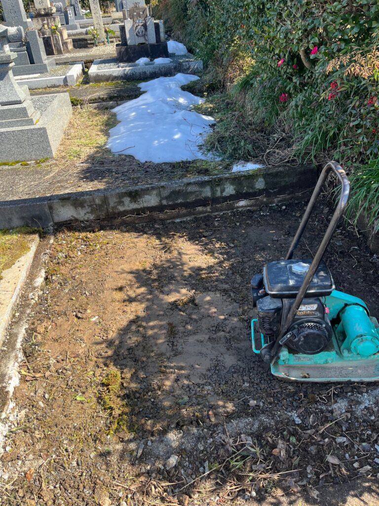 墓石・基礎コンクリート・残土の撤去、除去したあと、一旦地面に転圧をかけ固めました。雨などで土が流れるのを防ぐためです。