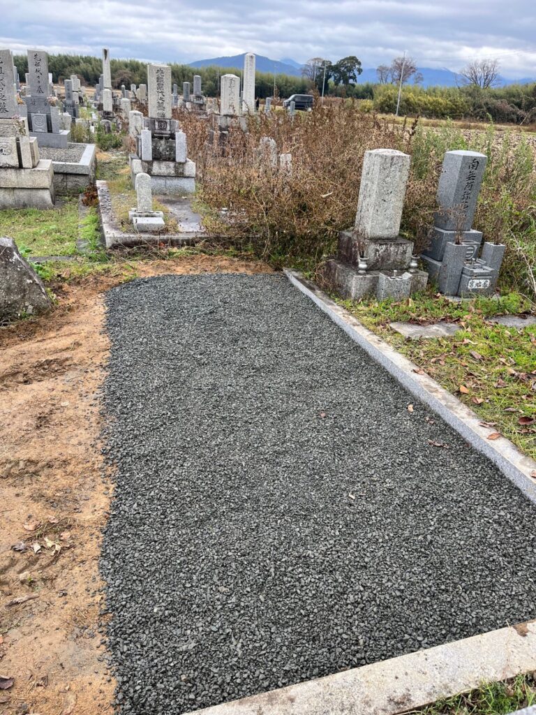 仕上げに、化粧砂利を敷いて完了です。墓地の規則や要望により、化粧砂利をしないケースもあります。作業前に確認させていただき実施しています。